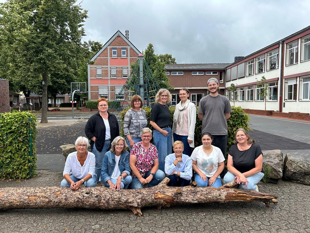 Unten v.l.n.r.: Birgit Langemeyer (OGS Gruppenleitung Klassen 1 und 4), Eva-Maria Hochscherff (Betreuung Klassen 1 und 2), Gabi Tiebel (OGS Klassen 2), Cornelia Ofenloch (OGS Gruppenleitung Klassen 2) , Saveen Rashid (Küchenkraft), Claudia Eing (Betreuung Klassen 2)